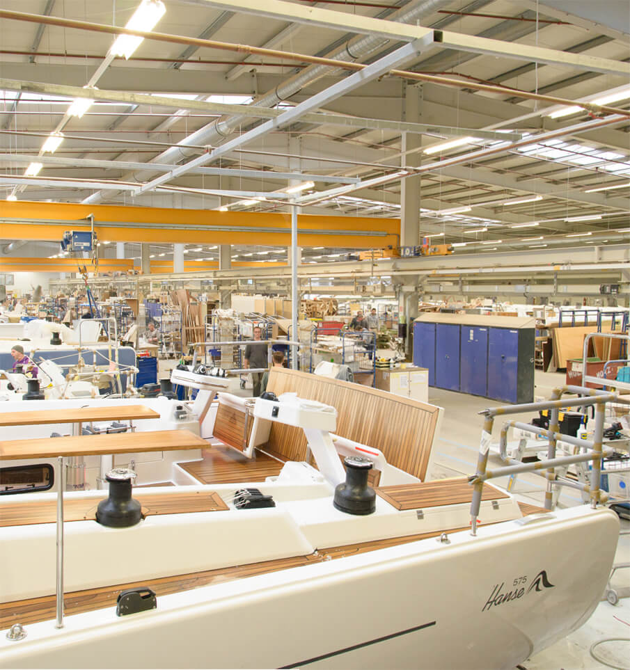 这一方案在位于Greifwald的两条生产线上进行,一条生产线生产小型船只,另一条生产大型船只,但是他们的长度都在10-20米之间。游艇的船体和甲板是在波兰的一家工厂生产的,并作为独立的两个部分进行运输,而游艇整体的建造和组装在生产线上的18个站点进行。