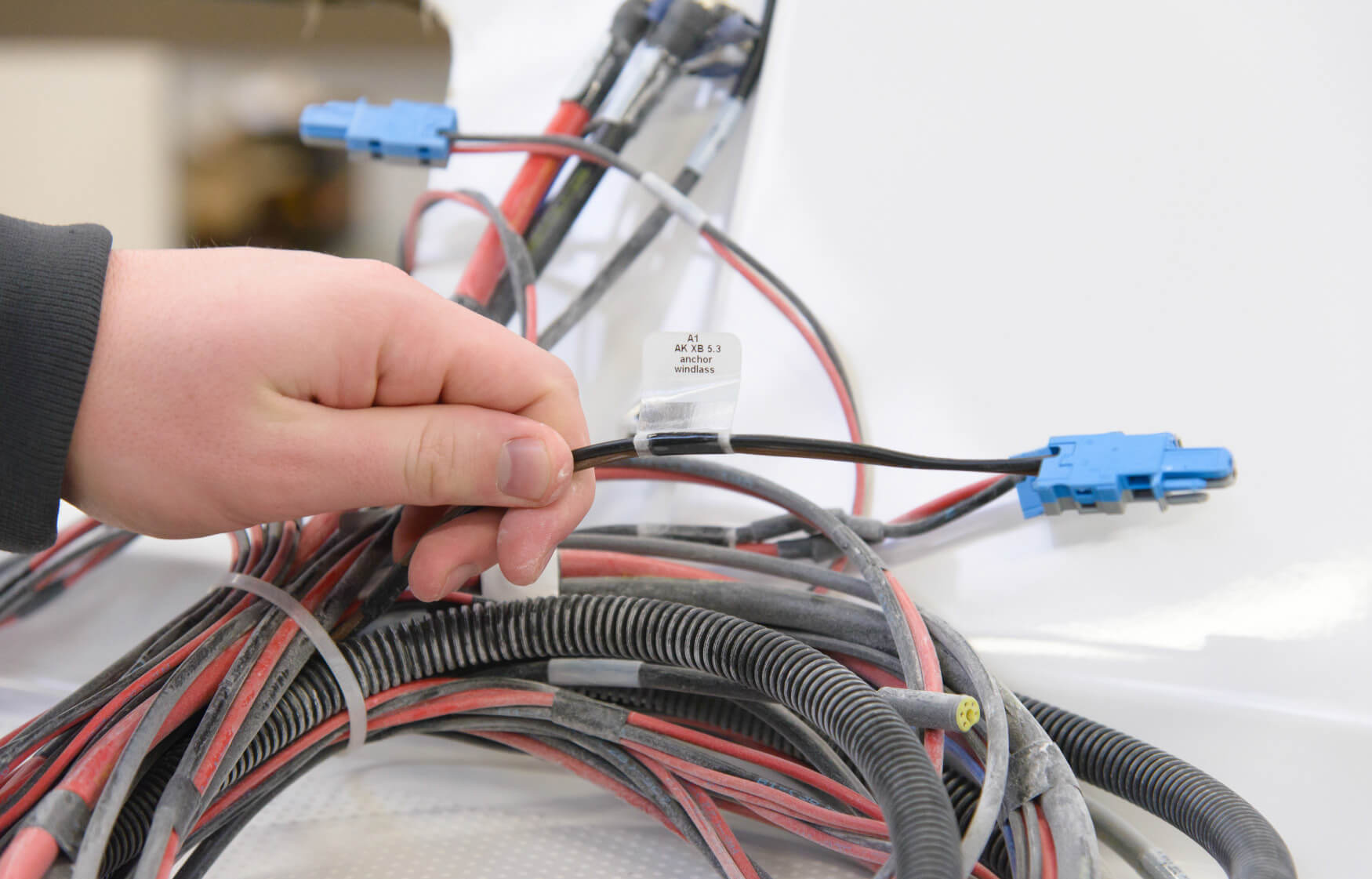游艇的船体和甲板在交付时即带有电缆线束。电缆线束制造商提前在12V设备用电缆上装备了标准化的两通道X-COM®连接器,并在末端缠上标签,将功能和电路板上的接插位置清楚地标记出来。这在最后的组装环节大大减少了错误的发生。