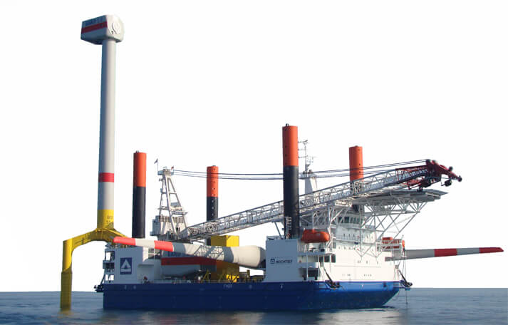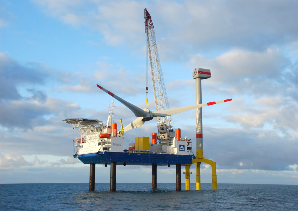 现如今,海上风力发电厂的建设正在如火如荼地进行。第一个测试场自2009年起并入电网供电,目前海上正架设许多风力发电设备,一些新区域还处于审批阶段。无论是从技术上还是从逻辑上来看,安装风力涡轮机都是一项具有极高要求的任务:如何运送360吨重的发电机机舱和61米长的转子叶片出海?为此,应用于北海的特殊自升式作业平台和船只正处在开发当中。第一批这样的自升式作业平台之一就是“Thor”号,它是根据北欧雷神命名的,并于2010年开始运营。“Thor”号的两个起重机之一在伸长至 51 米时能提起重达 500 公吨的物体。70m×40m的尺寸使“Thor”号看起来更像是个足球场而不是一艘船。进行装卸时4根82米长的桩腿下伸到海底。通过控制压舱水量,并抬升平台离开海面,就会形成强压到桩腿上的力,从而使桩腿与海床成为紧密相连的单元。