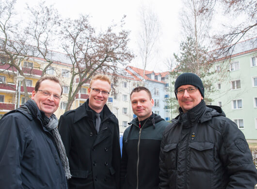 他们共同为Halberstadt地区的客户开发了适宜的技术:Sven Bendix (Halberstadt市政公用事业公司)、ManuelSchmidt (WAGO公司)、Matthias Schöps (WGH技术人员) 和Mi-chael Zawisla (DOMICIL公司)在Steinstraße街的住宅楼内院。
