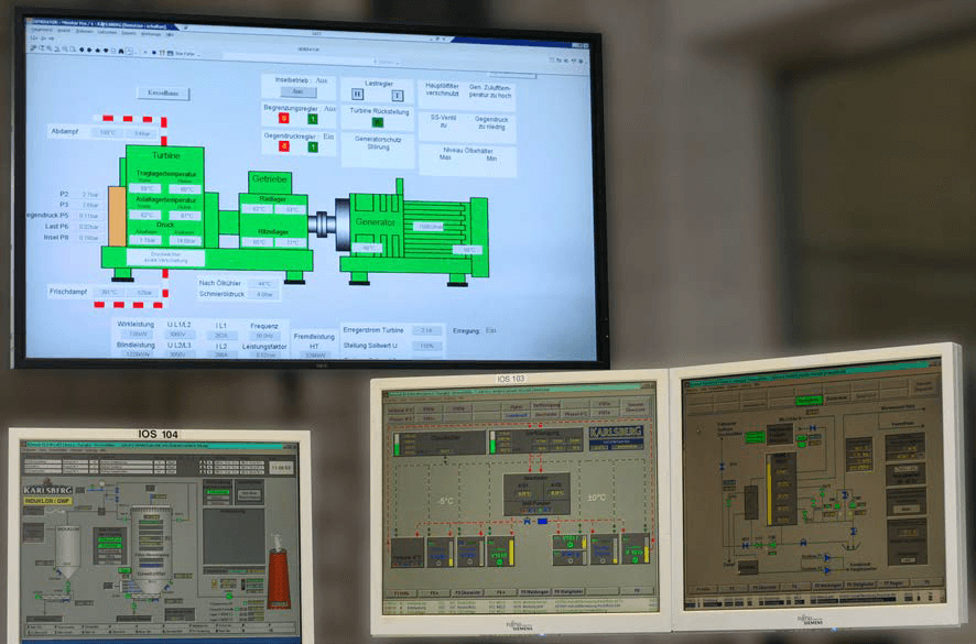 热量的供应在酿造初期十分重要。而冷却和瓶装过程则需要消耗大量的电能。位于洪堡的Karlberg酿酒厂将蒸汽形式的热能与蒸汽涡轮机产生的电能联系起来。燃煤锅炉产生压力为52bar的蒸汽用来驱动蒸汽涡轮机运转。蒸汽涡轮机继而可通过传动装置驱动3150V电压的发电机。