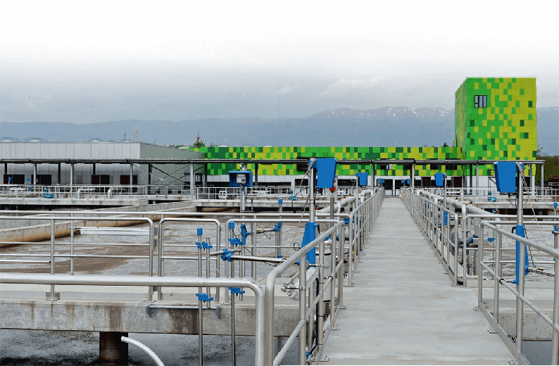 污水到污水处理厂的输送工作是由(每个最大流量为300L/s)四个泵完成的。STEP污水处理厂的最大流量为900 [L/s]。在污水预处理的第一个步骤中,细网组成的隔栅可以过滤掉6mm以上的固体物质。这些固体物质会被送进螺旋输送器中进行分离,之后还要经历清洗和脱水的工序,最后会在垃圾焚烧装置中进行焚烧转化成热能被利用。除此之外,还有专门洗沙用的池子用于进行污水除沙。这样,污水中的沙粒就会经过清洗后被挑拣出来,然后储存在矿车中直至被运走。污水经过预处理工序之后会被输送进4个带有喷嘴喷射氧气的水池中进行生化处理。通过这种所谓的“生化反应堆工序”可使污水中的带氧菌及其他微生物分解出碳的化合物。这其间还会生成大量的碳氧化物、氮元素及许多生物量等。特定的细菌可以将氨氧化成硝酸盐,此外,氯化铁参与的化学沉淀可以除磷。这个所谓的“生化反应堆”即絮状菌群在另一个净化池中沉淀下来之后会被吸走以便再利用。在污水净化的多个等级工序完成之后,净化的水会输送给邻近的罗纳省。