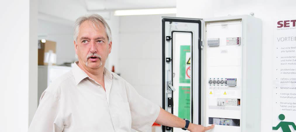 新的标杆:Schuster Energieversorgungssysteme首席执行官Jens Wich展示首款独立于制造商且可调光的LED紧急照明系统。该公司的系统由于采用了WAGO-I/O-SYSTEM 750,颠覆了市场格局。