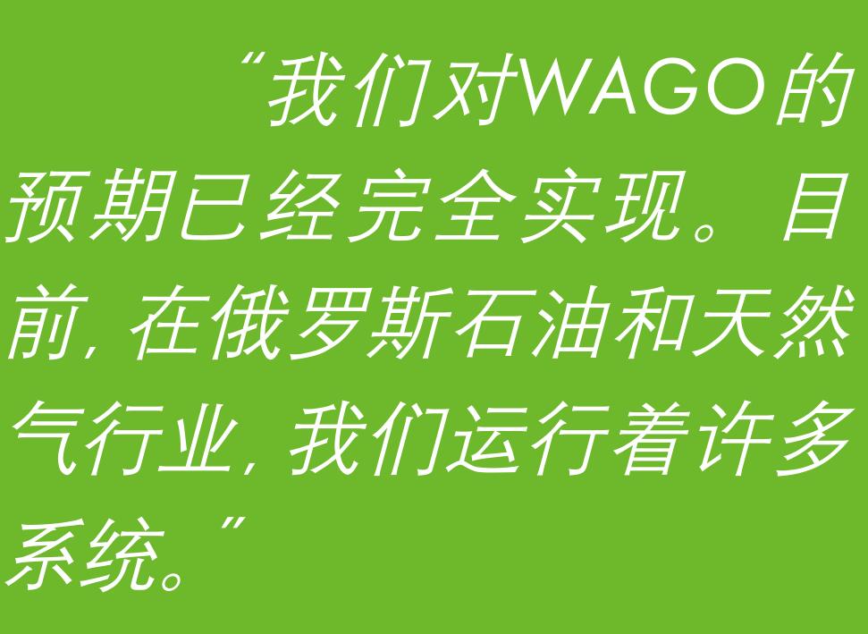 最终,Mochow认为这种协作取得的成功才是真正重要的。“实践经验已经证明,WAGO已经100%地实现了我们的预期。目前,在俄罗斯石油和天然气行业的所有现场,我们运行着许多运行可靠的系统,”Mochow总结道。