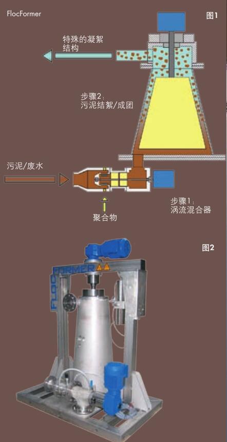 首先,在涡流混合器内把絮凝剂(聚合物)添加到污泥中,在絮凝完成后,把所产生的大量絮状污泥在絮凝反应器中进行挤压,从而生成经过高度固液分离的污泥絮团。